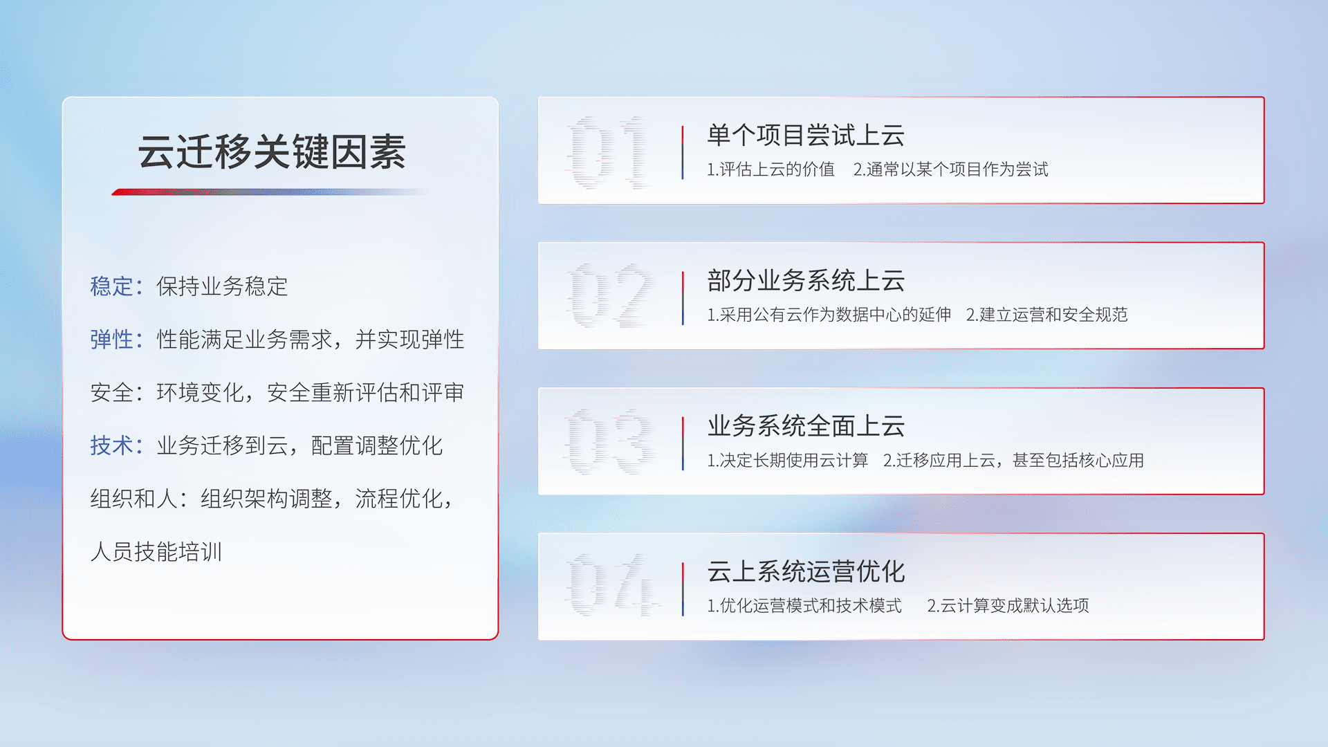 结合实际业务,,,,从规划设计、、、、云平台选型、、、、云原生改造、、数据迁移、、、、集成交付,,,,迁移全过程为客户识别最佳上云路径,,做好风险识别管理,,,设计网络架构、、、身份权限、、安全审计合规、、操作审计、、日志审计、、、监控告警策略、、、、多站点容灾设计等,,,,对云上基础设施进行整体规划,,提升IT治理水平,,,以满足弹性、、、高可用、、、、高性能的需求。。
