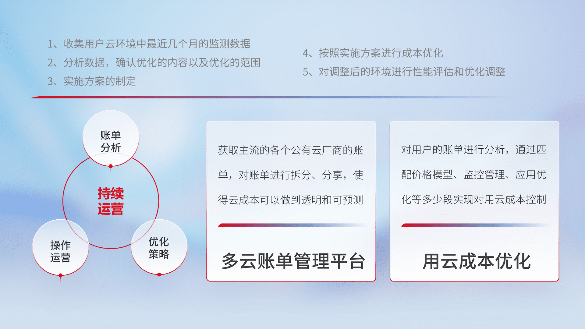 通过多云纳管,,,以统一的资源数据模型把客户的云资源进行抽象和封装,,进而实现对多云资源的统一操作,,,,保障云资源管理的可靠性、、稳定性与可用性。。量身定制化运维内容,,,配置、、开发运维、、、补丁管理、、、、备份、、、监控、、、认证和访问管理、、、审计和日常巡检等,,,,保障在用云过程中的可靠度,,,稳定度以及高可用率。。。