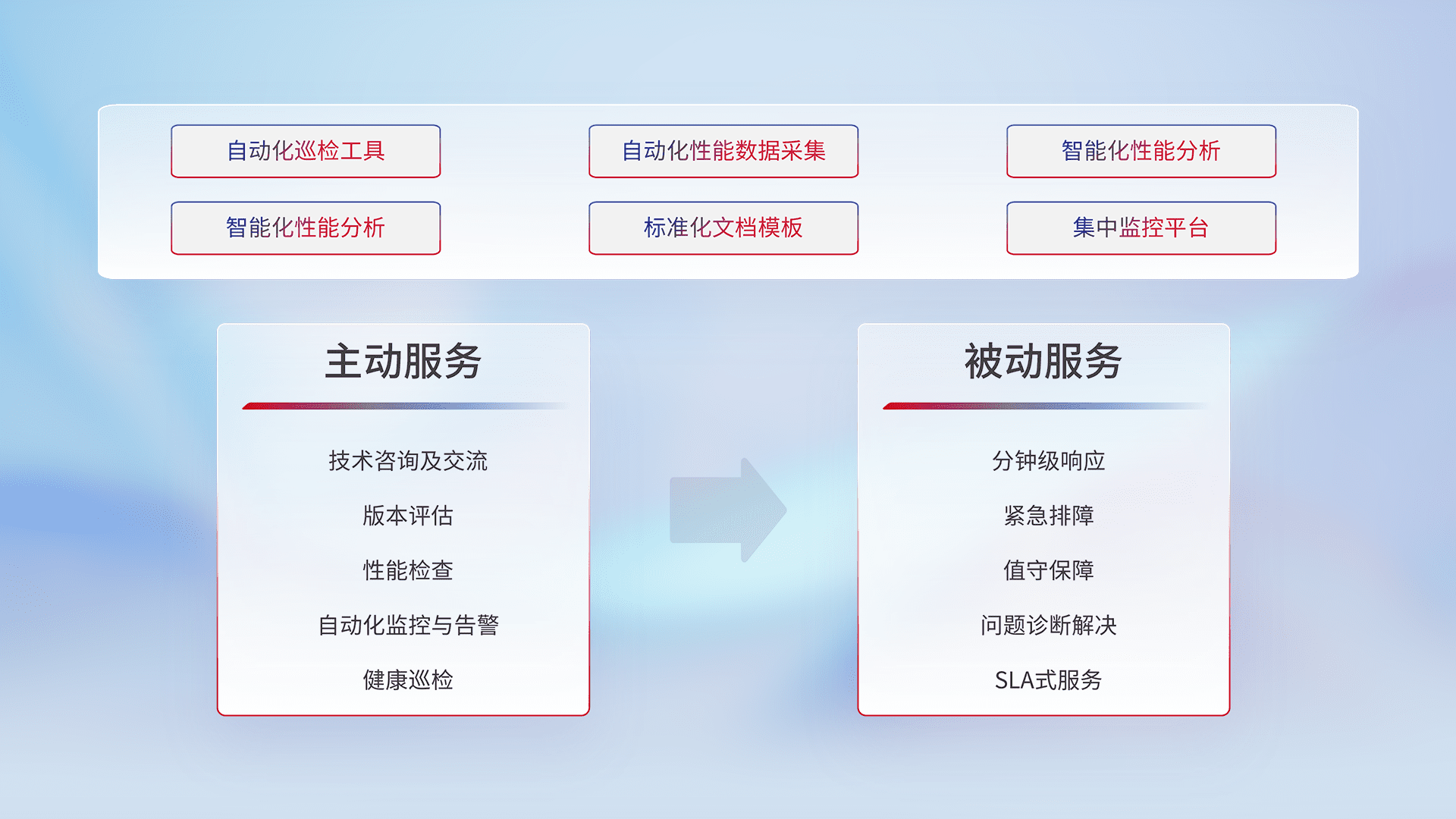 智能化工具和标准化文档,,,保障服务质量,,提供主动服务(包含技术咨询、、版本评估、、性能检查、、、、自动化监控与告警、、、健康巡检)和被动服务包含(分钟级响应、、、、紧急排障、、值守保障、、、、问题诊断解决、、SLA服务)。。